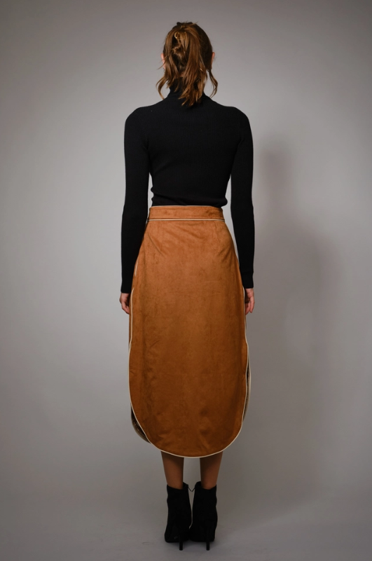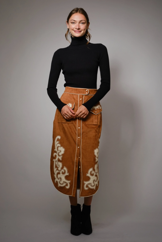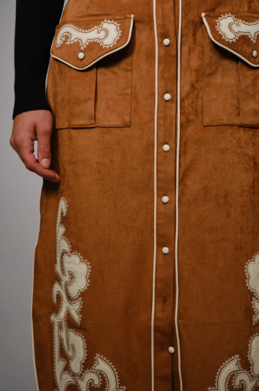Western-inspired midi skirt featuring a soft suede texture, front snap button closure, and intricate contrast embroidery along the curved hem and pockets. Patch flap pockets and piped seams add structure and detail, while high side slits offer ease of movement.