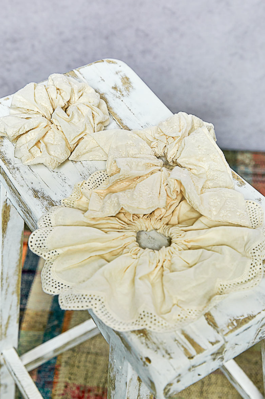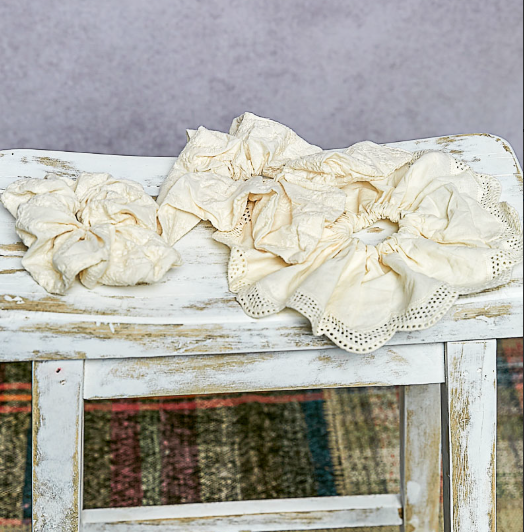 One pack includes 3 different designs in a soft ivory tone, featuring two scrunchies made from delicate embroidered fabric and one accented with broderie detailing along the edge. The mix of textures creates a romantic, feminine look that pairs beautifully with both casual and dressy outfits. Lightweight and gentle on the hair, these scrunchies add an elegant touch to your everyday styling.