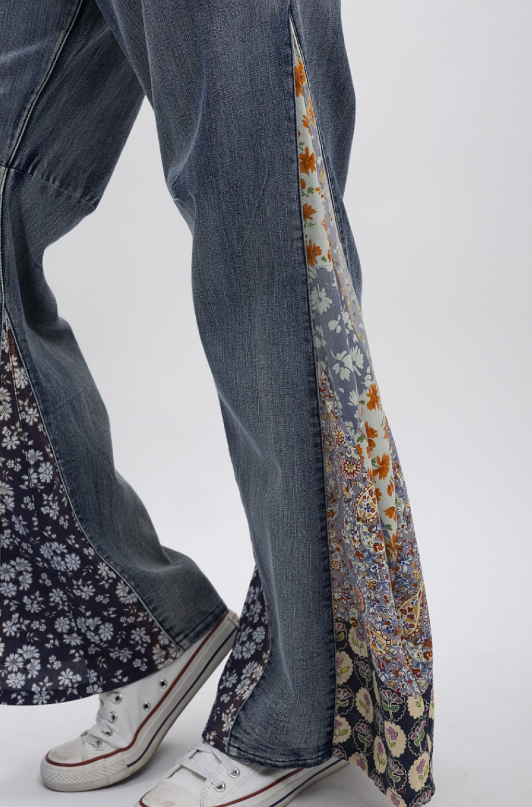 Flared wide leg curved silhouette lightweight jeans with zipper and button fly closure and floral mix side detail in a relaxed fit