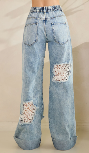Restocked 1/28!!!!Effortlessly chic meets comfort in these mineral-washed jeans featuring delicate lace inserts and a stretchy back waistband. The distressed detailing adds an edgy, lived-in vibe perfect for laid-back days.