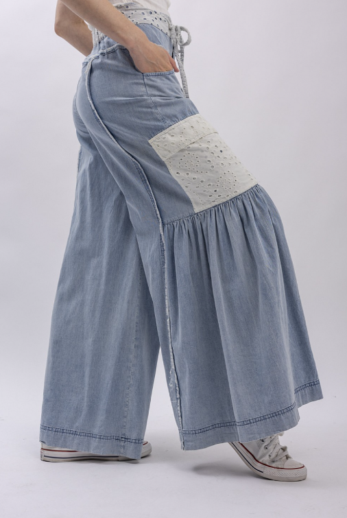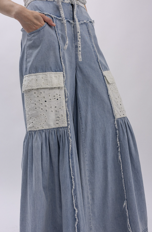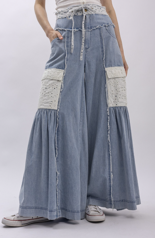 Effortlessly chic wide-leg jeans crafted from lightweight cotton chambray with a mineral wash finish. Featuring playful eyelet patch pockets and matching eyelet trim at the waist, plus a comfy back elastic waistband for all-day ease. Raw seam detailing adds an edgy touch to this laid-back essential.