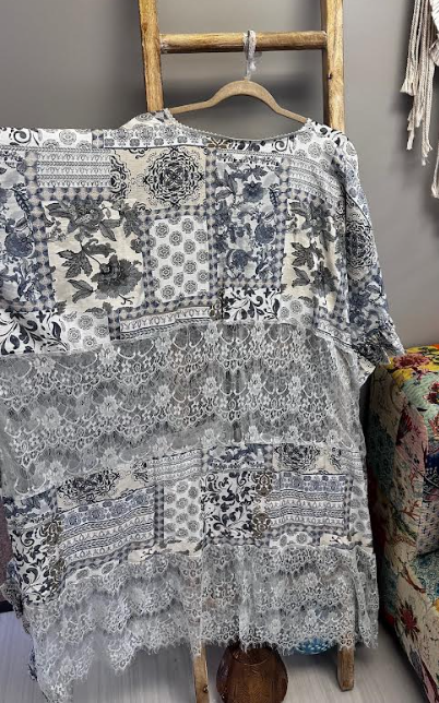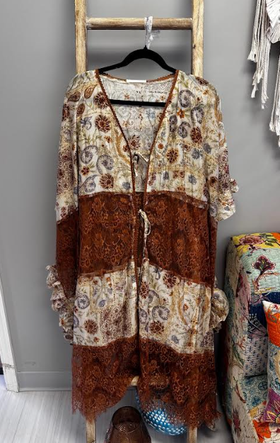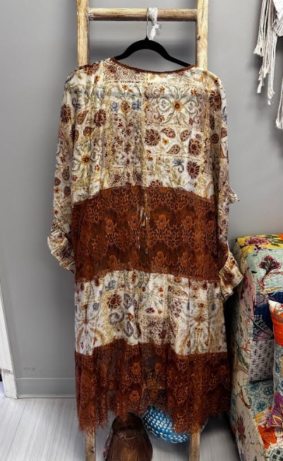 Effortlessly chic meets carefree vibes with this short-sleeve kimono featuring a charming front tie closure. The bohemian print brings wanderlust-worthy style, while delicate lace panels and ruffled accents add that perfect touch of feminine flair. Layer it over your favorite tee or wear it solo for an instant mood boost.