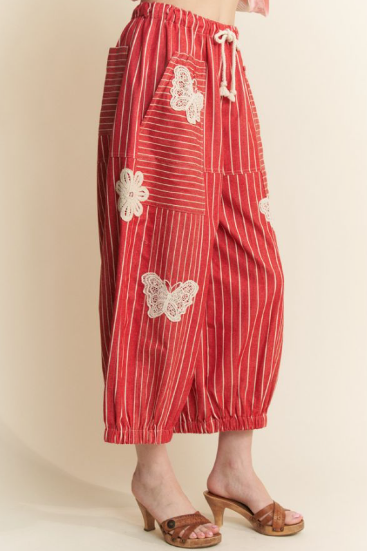 Elevate your boutique collection with these striped wide-leg pants, featuring crochet butterfly and floral appliqués for a touch of charm. Designed with an elastic drawstring waist, patch pockets, and cropped silhouette, they balance comfort with standout detail. Perfect for versatile styling, these pants bring playful sophistication to everyday wear.