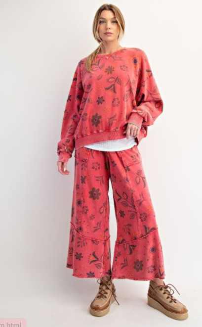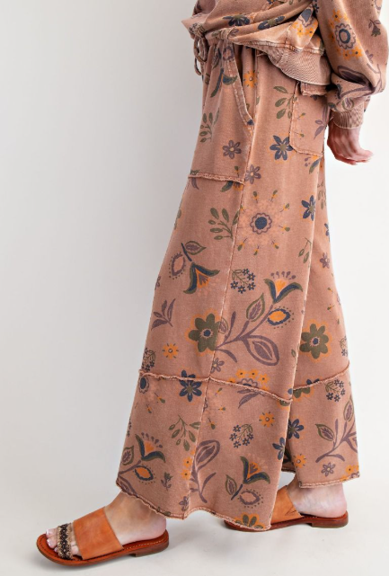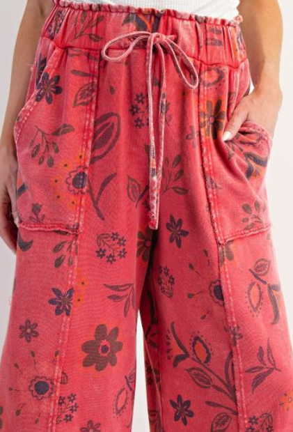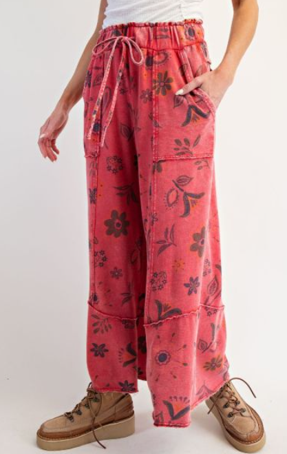 Restocked 10/3!!!Floral printed wide leg french terry pants with exposed seam detail, deep front and back patch pockets and an elastic waistband for a comfortable fit