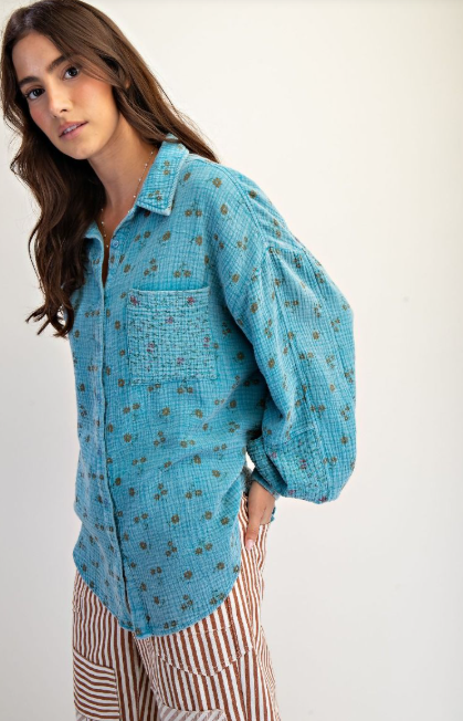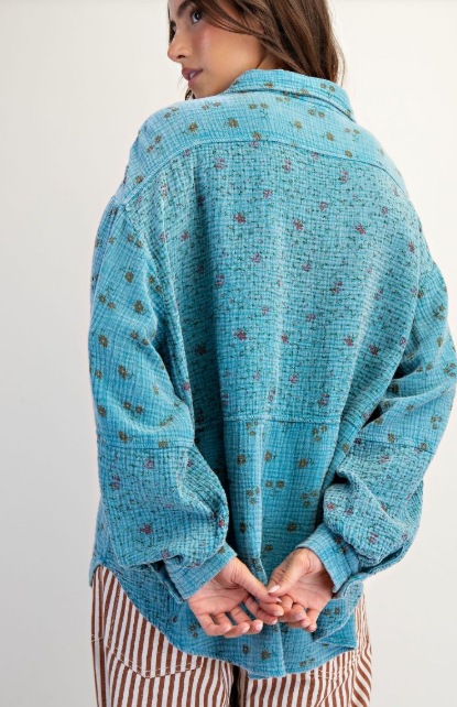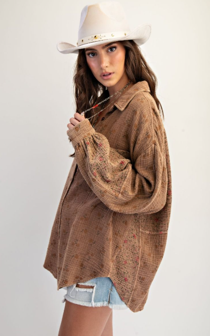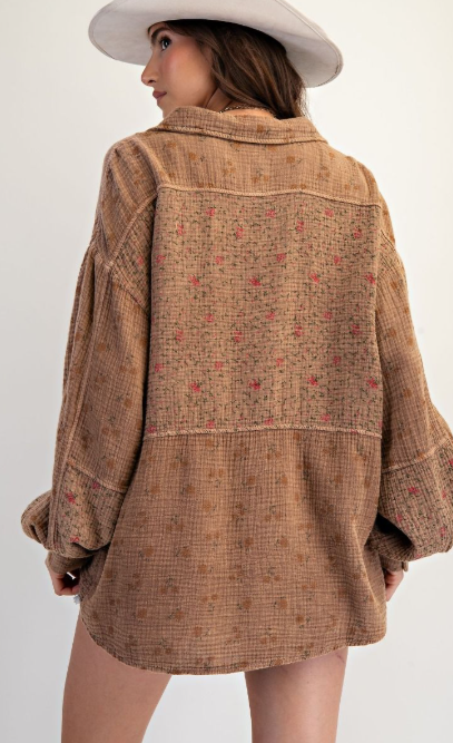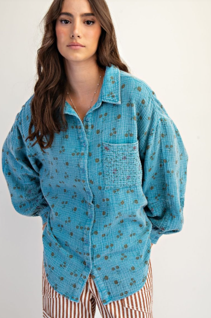 Floral print button down mineral washed cotton gauze top