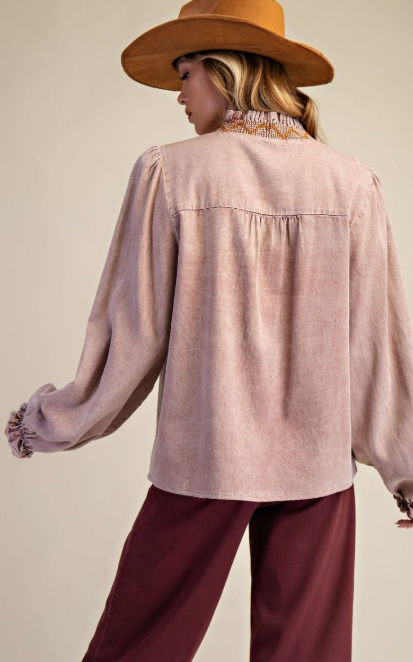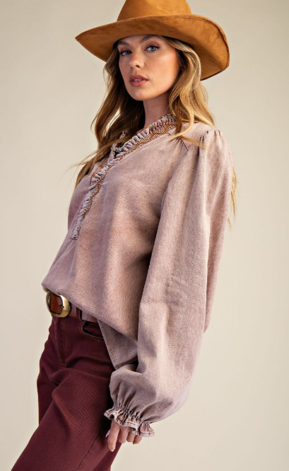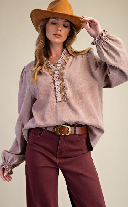 Twill cotton top with v-neckline ruffle trim embroidered stitching, long puff sleeves in a relaxed, flowy fit.