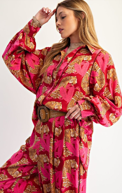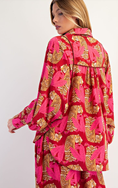 Fun tiger jungle printed button down top with a pleated back yoke and contrast piping detail in a relaxed fit