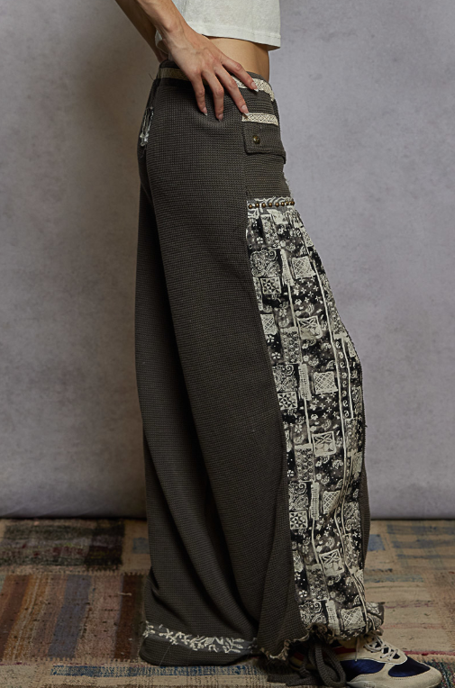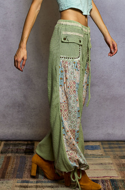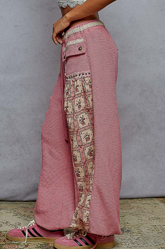 Say hello to your new favorite statement pants — where vintage charm meets comfy-cool. These pink woven beauties feature wide legs, side panel patchwork with delicate floral print, and utility-inspired lace trim studded pocket details that bring the sass and the storage. Plus the elastic waist has your back for maximum comfort and adjustability.