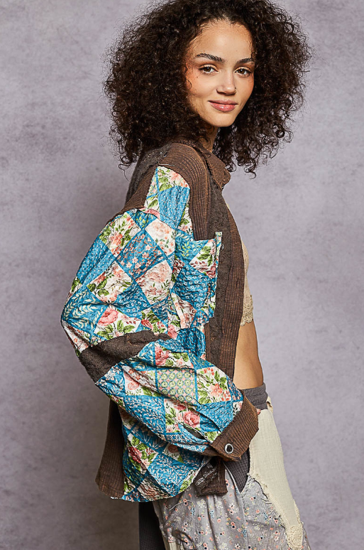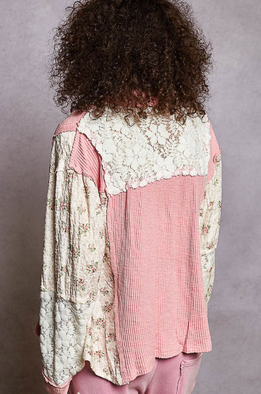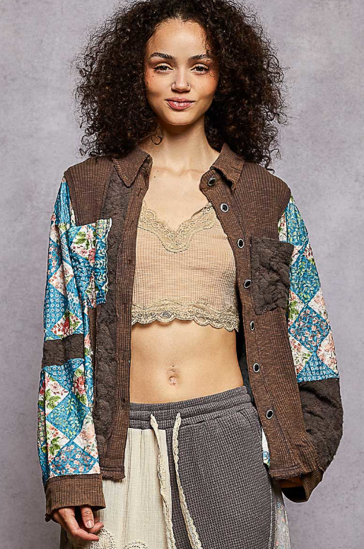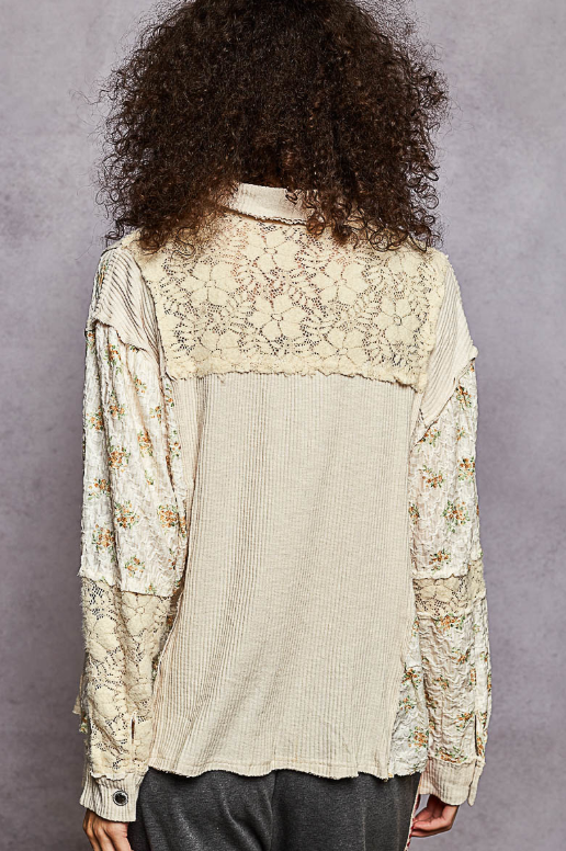 Lightweight button down ribbed shacket with contrast print, lace panels and front pocket in a roomy fit.