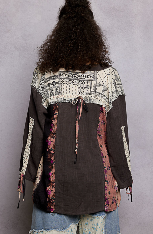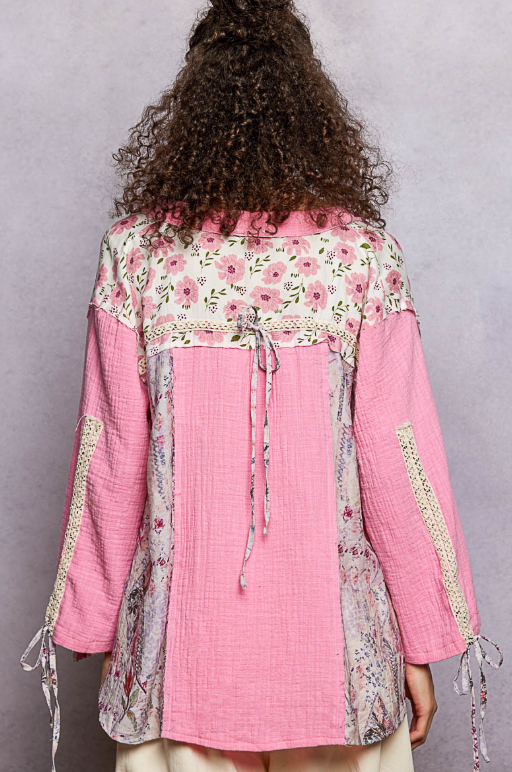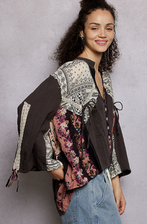 Slip into effortless style with this breezy double gauze top featuring a flattering deep V neckline and three-quarter sleeves. The relaxed silhouette pairs perfectly with the charming floral contrast and delicate string accents for a look that's both laid-back and undeniably chic.