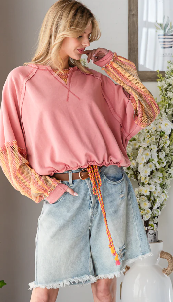 Cozy comfort meets a dash of boho charm with this French Terry pullover! The playful crochet net sleeve contrast adds just the right amount of texture and visual interest, making this piece perfect for casual days when you want to look put-together without trying too hard.