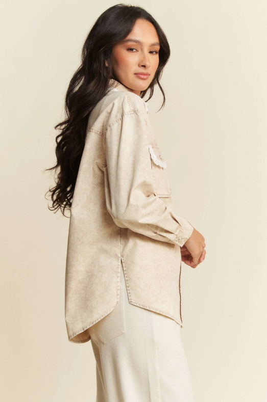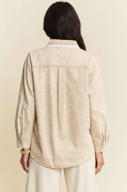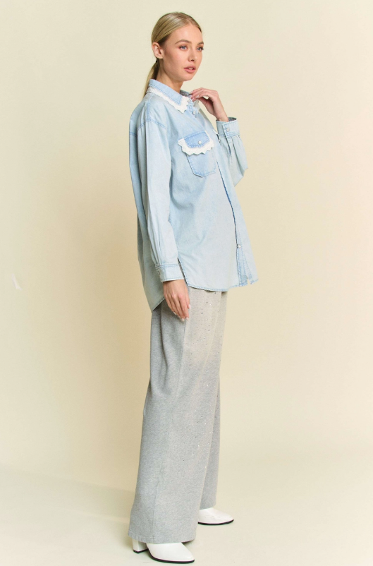 This lace-trim denim button-down shirt blends casual ease with feminine charm. Featuring delicate lace accents on the collar and chest pockets, it elevates classic denim with soft detailing. Designed with a relaxed fit and versatile wash, it pairs effortlessly with trousers, skirts, or casual joggers