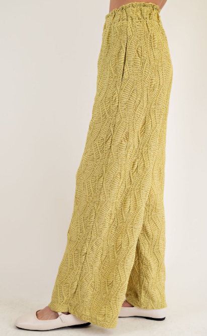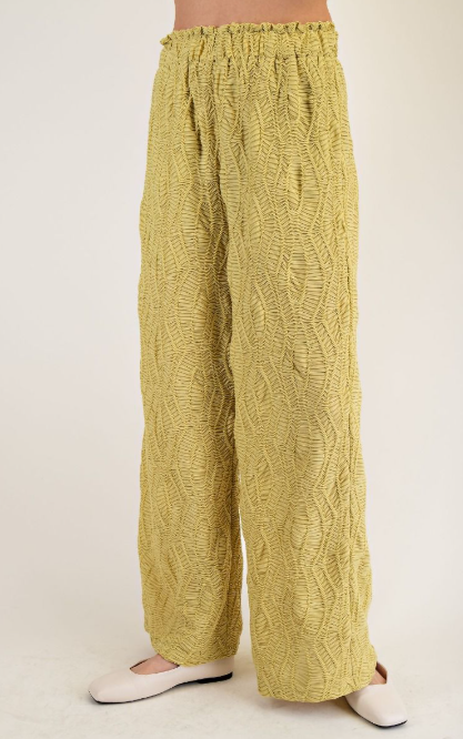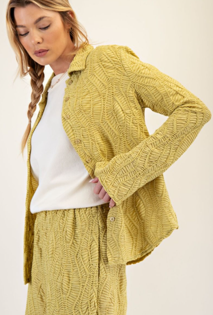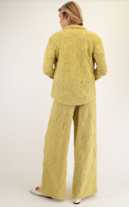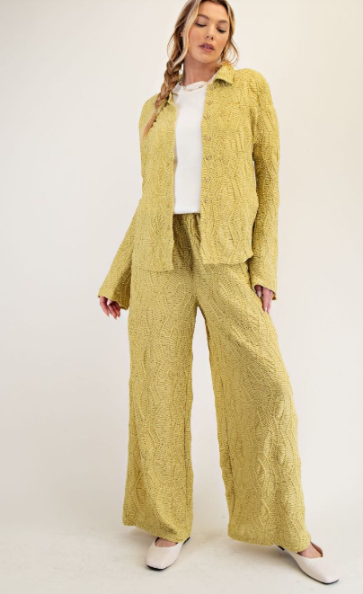 Textured woven set in a lightweight, relaxed and loose fit. The pants have pockets, and an elastic waistband for a comfortable fit and the button down top is designed with a rounded hem in lightweight relaxed fit.