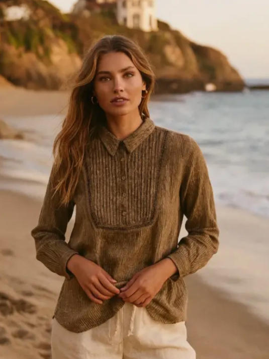 Crafted in soft, textured lightweight fabric, this blouse blends vintage tailoring with relaxed coastal ease. Designed with a pintuck bib front, button-down placket, and collared neckline, it offers timeless structure while keeping a breezy, effortless fit. The earthy olive hue pairs perfectly with natural linens or denim, making it a versatile piece that transitions from seaside strolls to evening gatherings. Made with care in Los Angeles, each blouse carries an understated elegance rooted in both comfort and style.