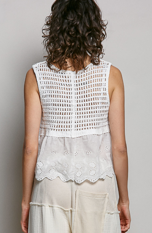This breezy sleeveless top features a charming round neckline and an effortlessly relaxed silhouette. Crafted with delicate crochet work, it showcases eye-catching ribbon embellishments and couching details that add dimension and flair. The loosely woven back keeps things airy and fun, while scalloped edging along the borders brings a sweet, finished touch. Perfect for layering or wearing solo when you want to feel light and fabulous.