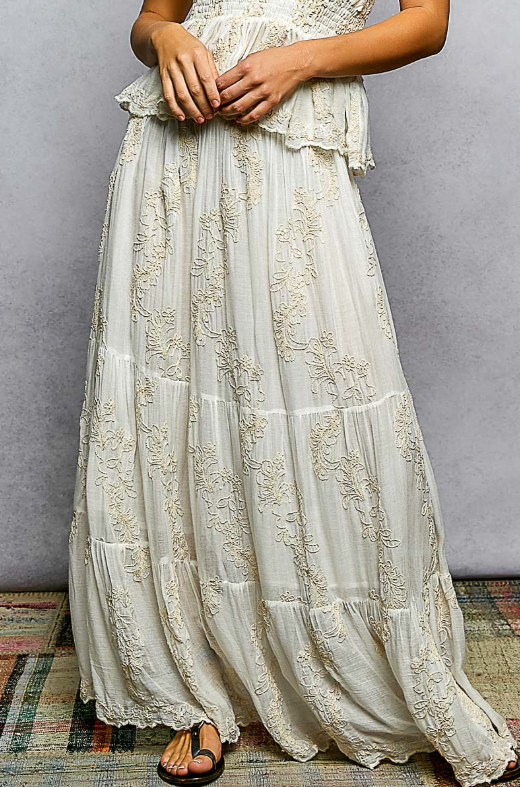 Twirl in style with this gorgeous maxi skirt, complete with delicate embroidery details, a charming tassel drawstring, and a comfy smocked waistband that hugs just right. Perfect for effortless elegance with a fun twist.