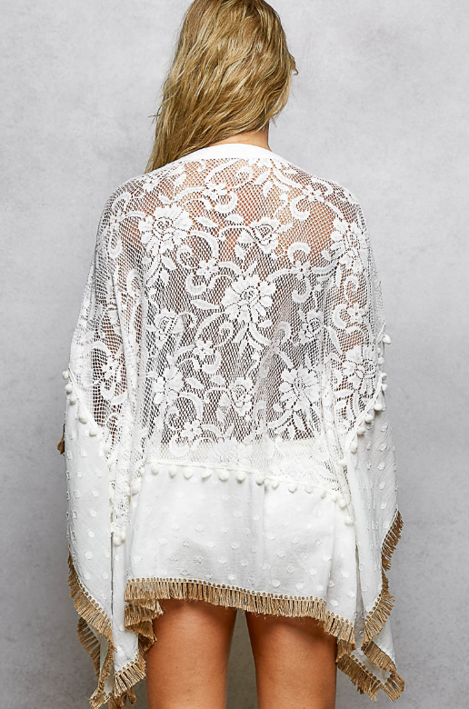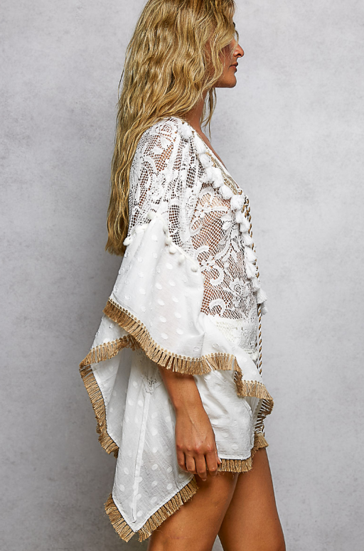 This poncho top has textured woven detail, playful lace and tassel trim adding personality, while an adjustable drawstring lets you customize the fit to your vibe.
