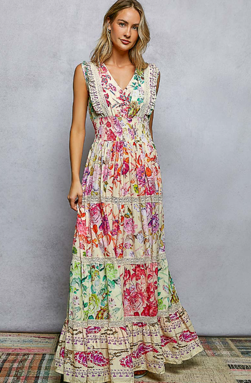 V-neck sleeveless long dress made from printed cotton, featuring trim details, an emphasized smocked waist, ruffle accents, and a delicate floral pattern. A feminine and effortless piece perfect for everyday or special occasions.