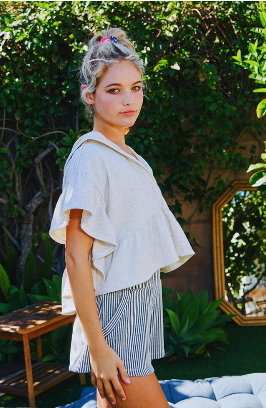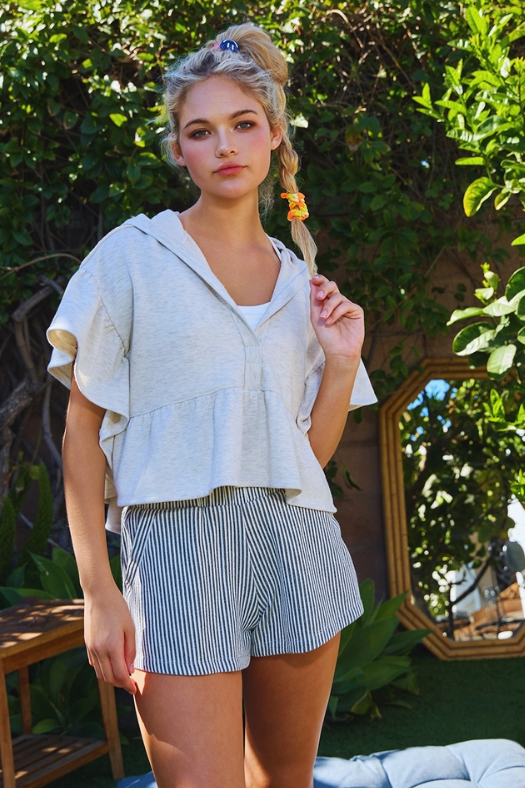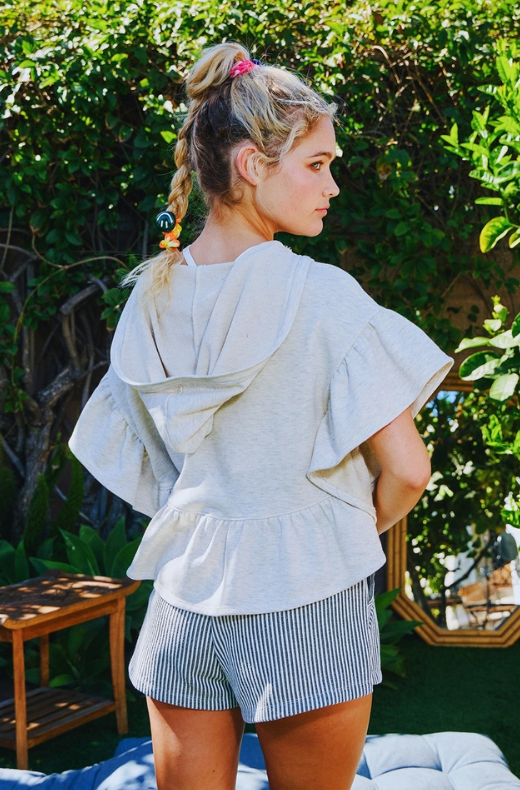This short sleeve hoodie is a perfect toss on and go while still looking cute! It has ruffle butterfly wing sleeve detail and a high-lo hemline, falling at a cropped length.