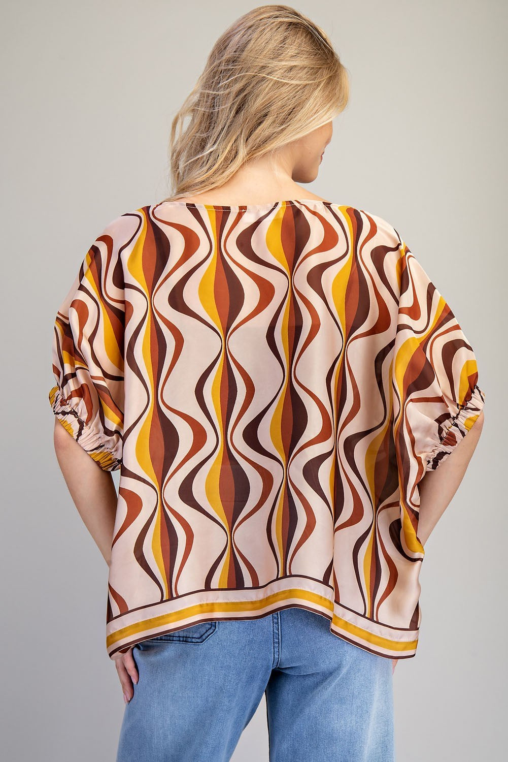 This retro inspired top features a round neckline, airy dolman sleeves with gathered elastic cuffs, and a fluid boxy silhouette, elevated by a bold wave pattern print and a contrast border hem for a statement finish.