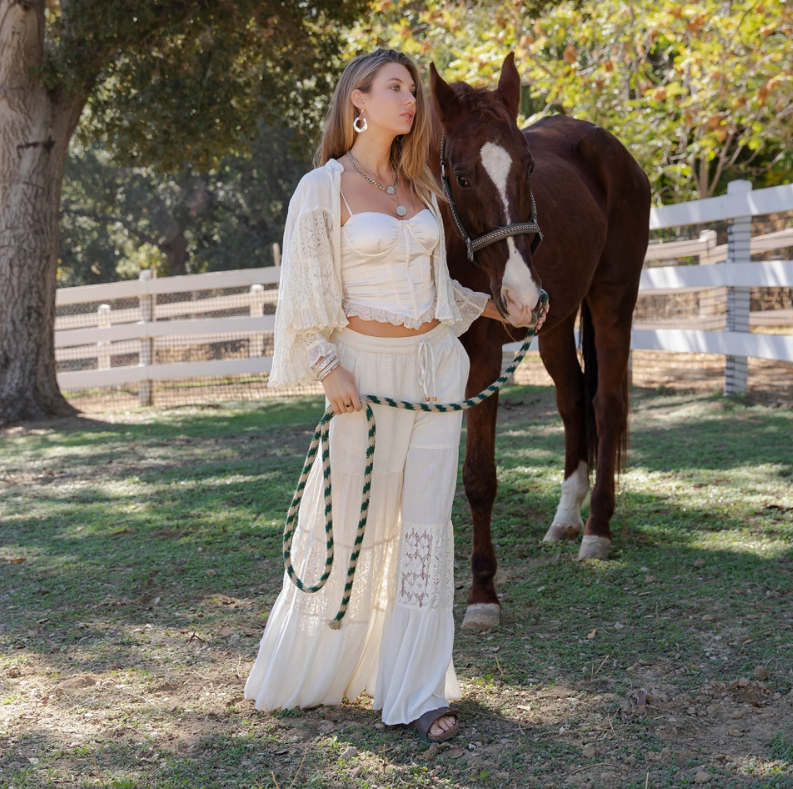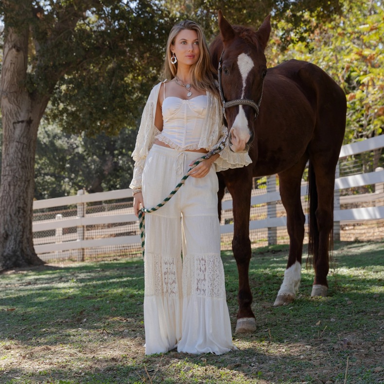 Step into effortless boho vibes with this charming two-piece set that's equal parts romantic and adventurous. The delicate lace ruffle shrug pairs beautifully with cascading tiered wide-leg pants, creating a look that's ready for beachside getaways, music festivals, or your next western-inspired adventure. Blended from breathable flax, soft cotton, and silky rayon, this artisan-crafted ensemble drapes with an easy, breezy flow that feels as good as it looks.