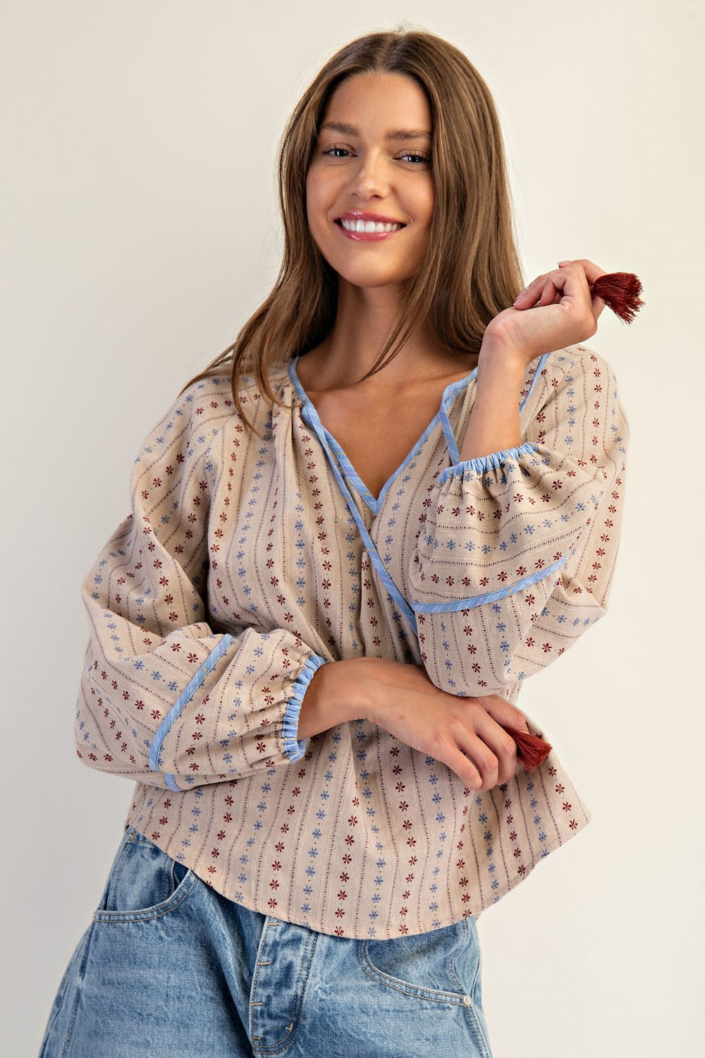 This lightweight woven blouse features a vertical floral stripe print, a notched neckline with contrast trim and tassel ties, long bubble sleeves with elastic cuffs, and contrast piping along the sleeves for a charming, folk inspired finish.