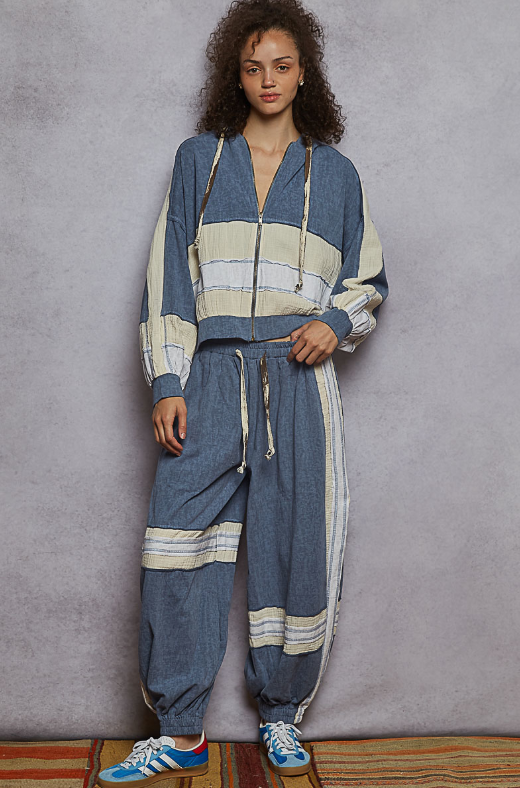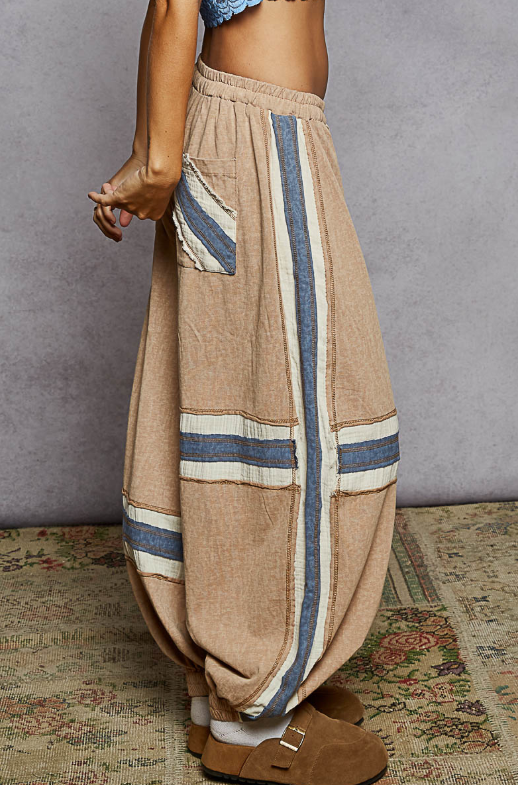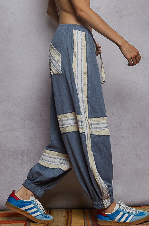 Crafted from double gauze with eye-catching color-blocked patchwork, this set delivers serious vibes. Bold overlock stitches and exposed outseams keep things visually interesting, while a hand-painted waist loop adds that one-of-a-kind flair. The vintage wash gives them that perfectly lived-in feel without sacrificing modern style. An ultimate cozy-cool combo.