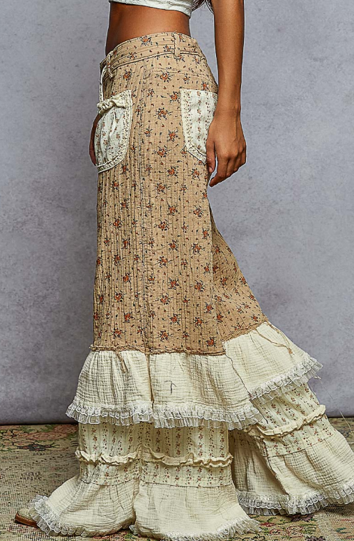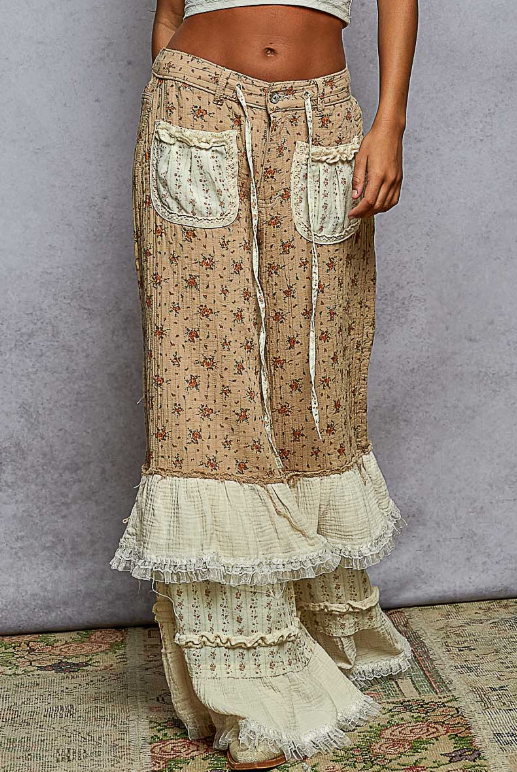 Wide leg double gauze pants with front patch pockets, reverse ruffle detail, and a metal flower button closure with drawstring
