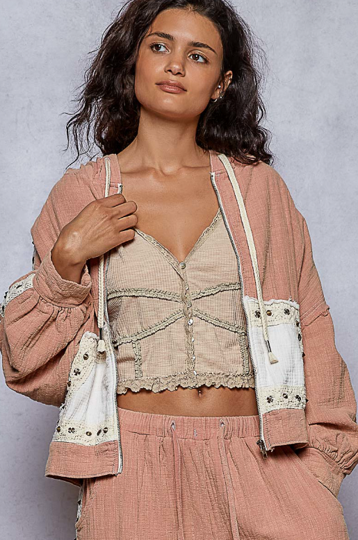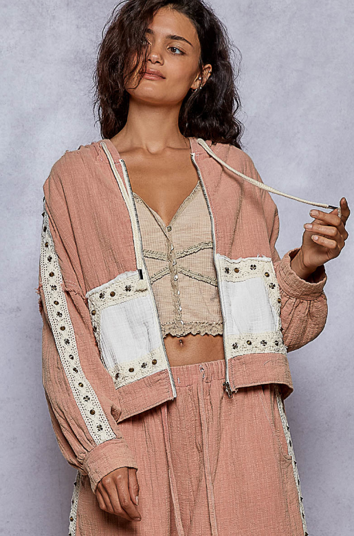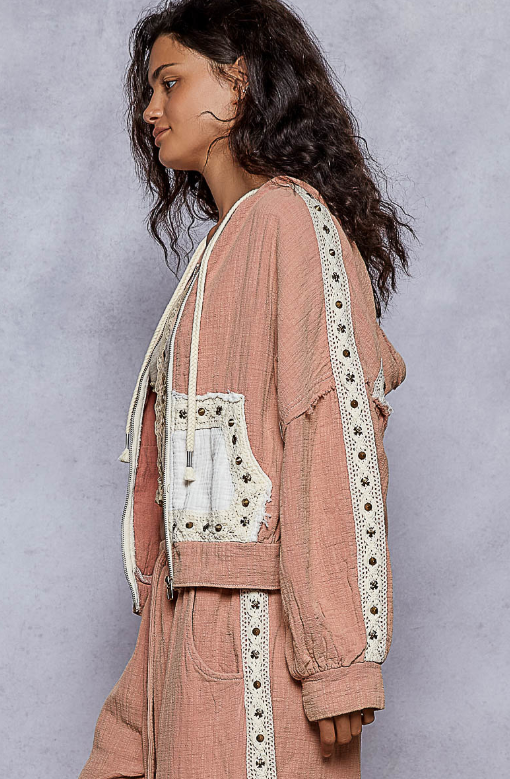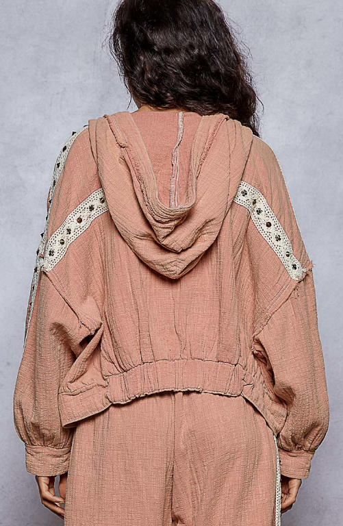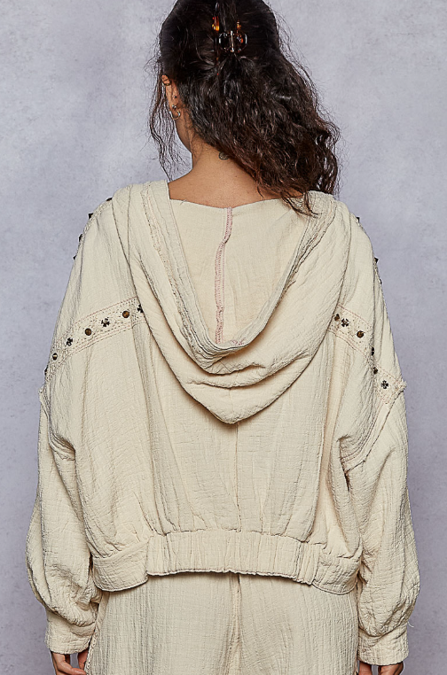 Double gauze cotton hoodie with crochet trim, outseam and stud detail with a back elastic waistband, vintage washed