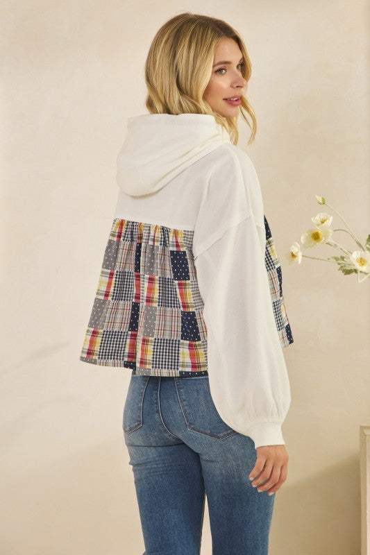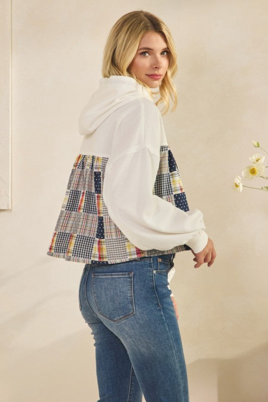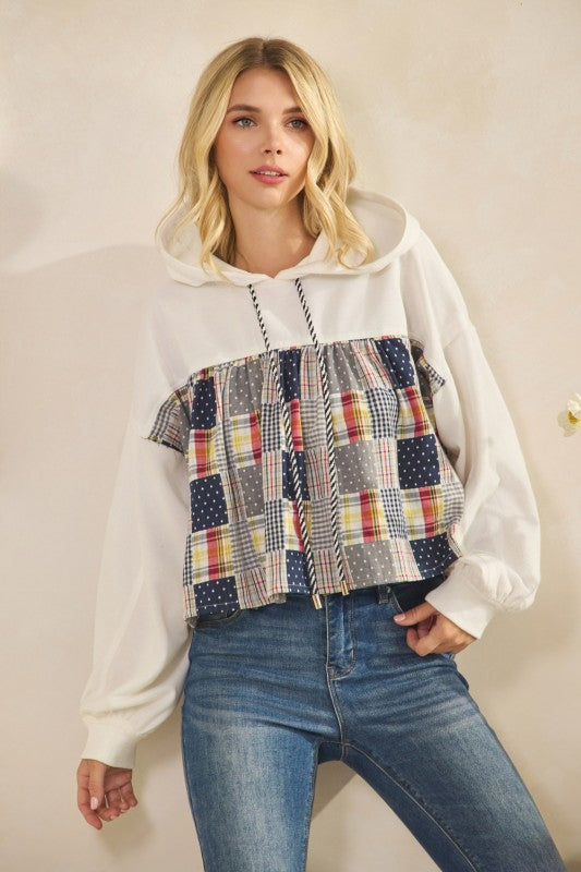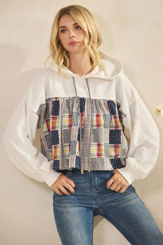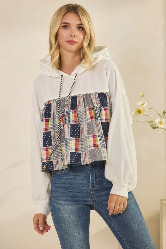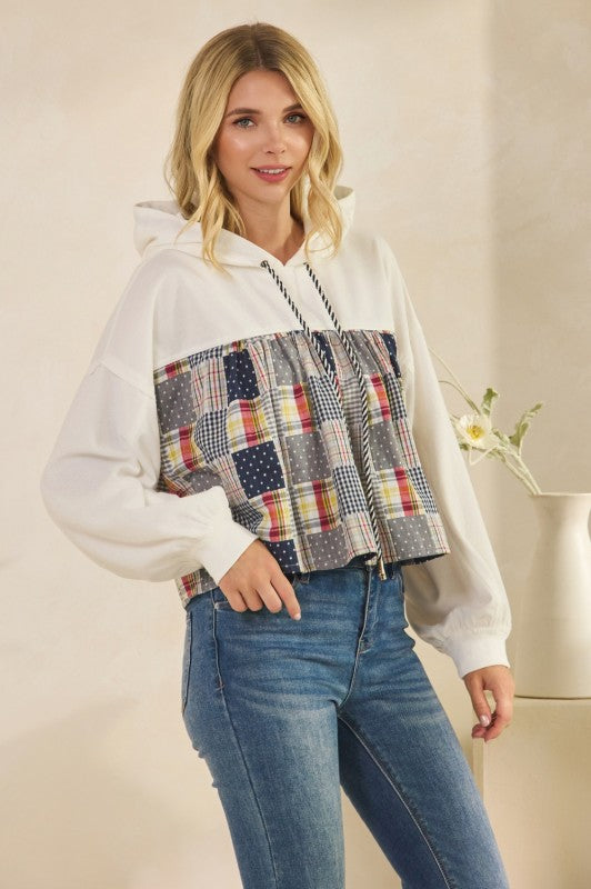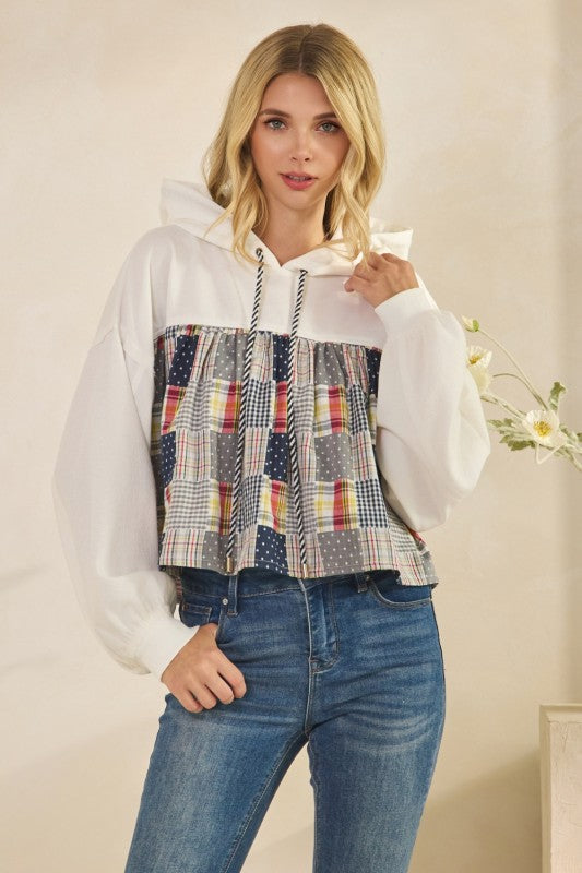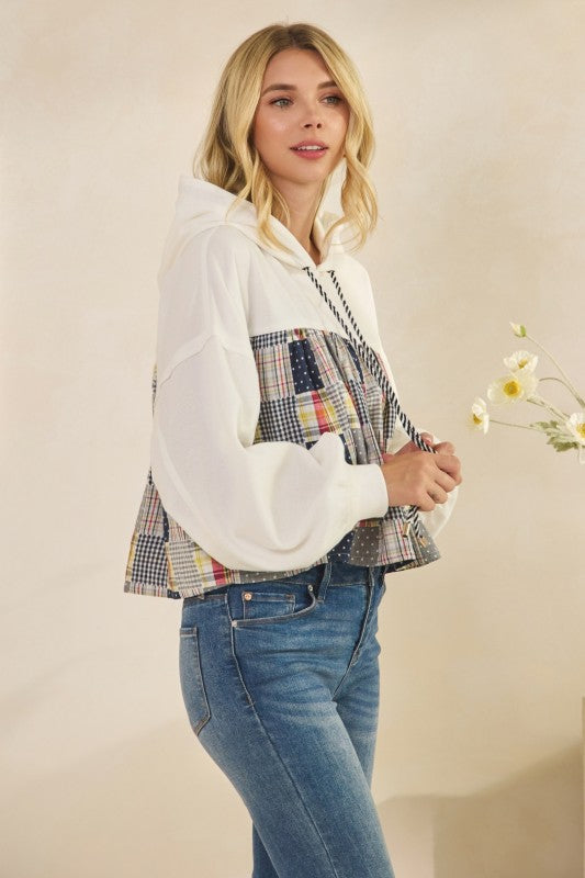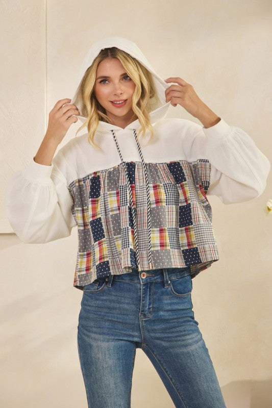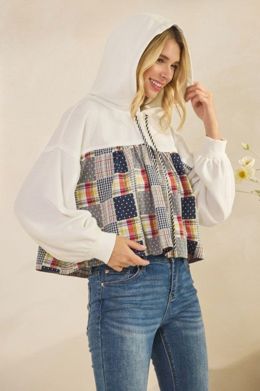 Cute flowy plaid patchwork contrast hoodie with balloon sleeves at a semi cropped length with accentuated drawstring