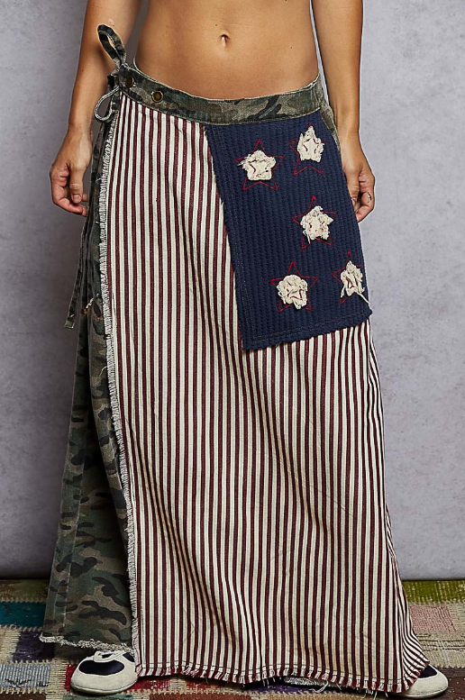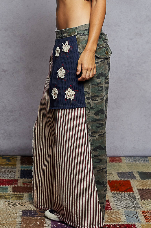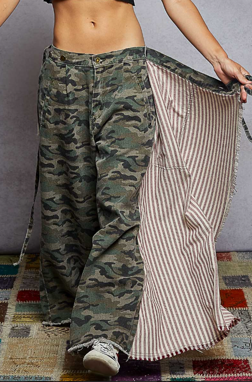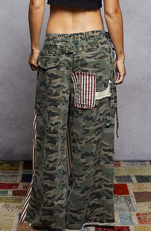 Wide leg camo twill pants with front wrap American flag design, raw edge, vintage washed